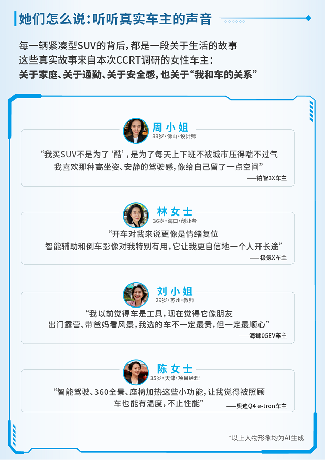 报告中的车主访谈也印证了这一点,多位女性车主提及“高坐姿的安静驾驶感”、“智能辅助”以及“座椅加热”。这些具体需求,共同指向了汽车作为“生活伙伴”的情感角色。